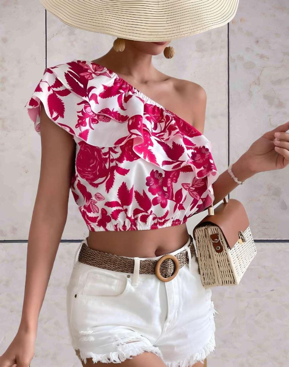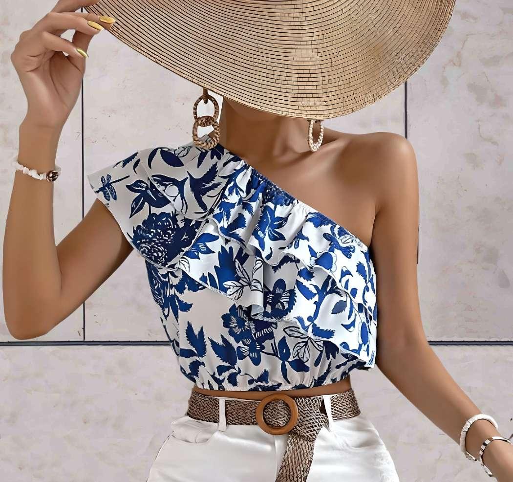 Aleida - stijlvolle eenzijdige mouw, stretchy bloementop met ruches in twee kleuren
