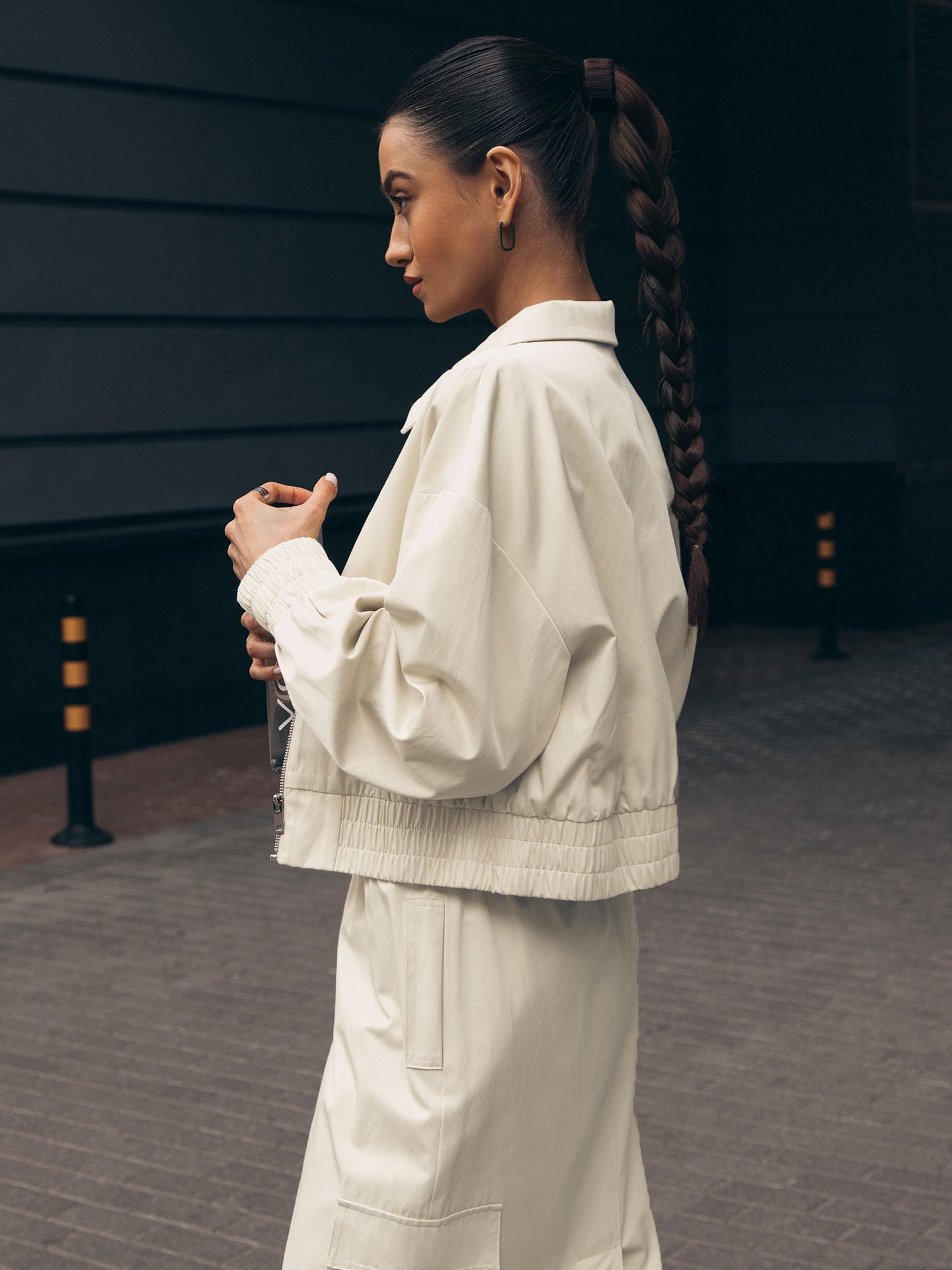 Dit leuke jack heeft lange mouwen, een kraag en sluit met een rits. Het jack heeft een korte pasvorm en is gemaakt van een soepele stof.
