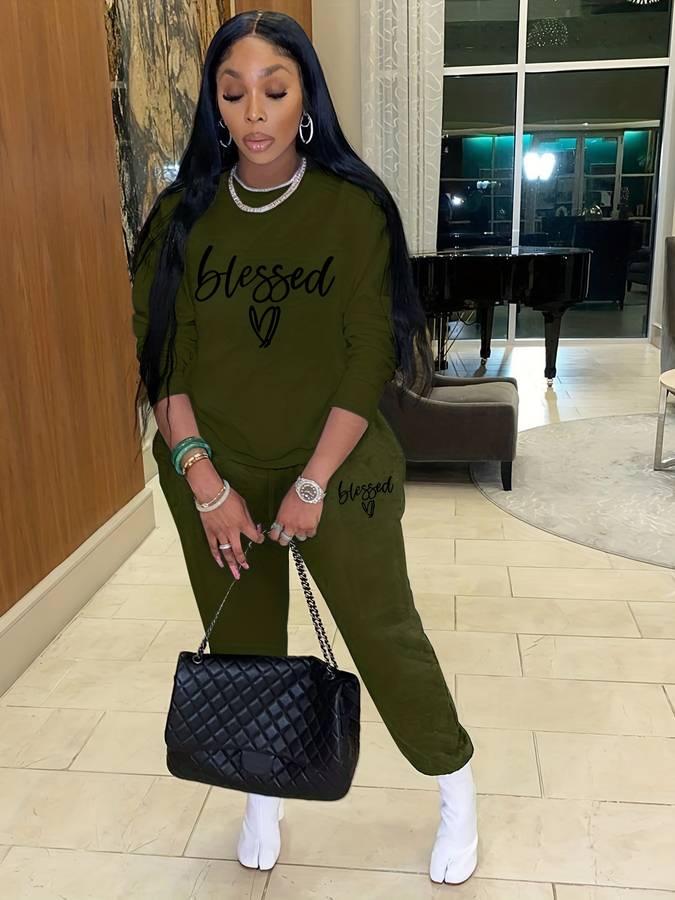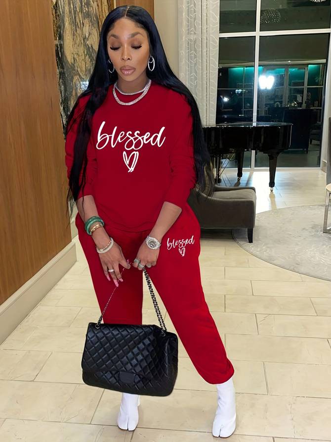 Omarm de zegeningen van de winterse stijl met onze Blessed tweedelige set met letterprint. De top met lange mouwen en joggingsbroek met trekkoord, bedrukt met letters, bieden niet alleen warmte maar ook eigentijdse flair. Combineer met enkellaarsjes voor chique uitstraling of sneakers voor een relaxte look.