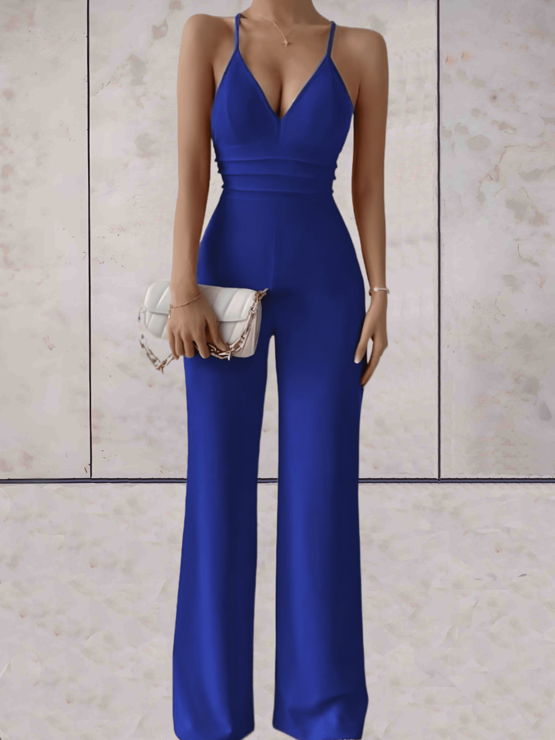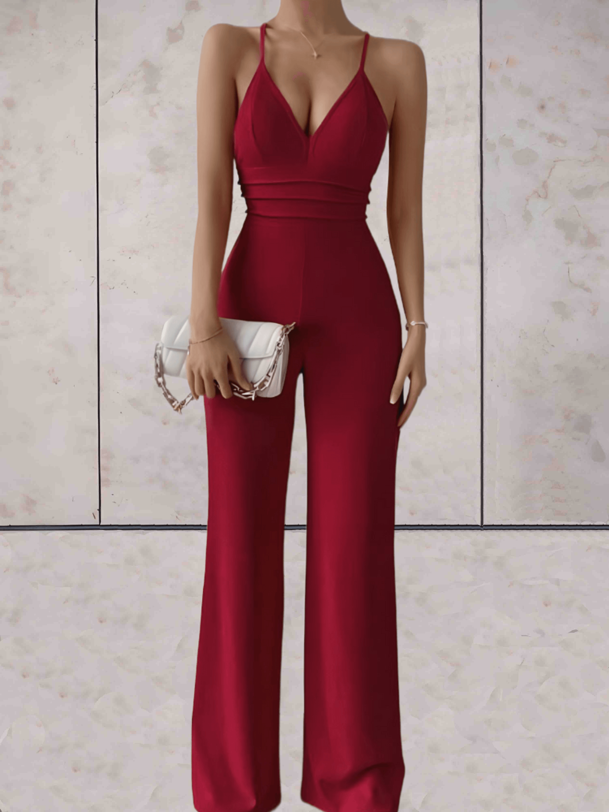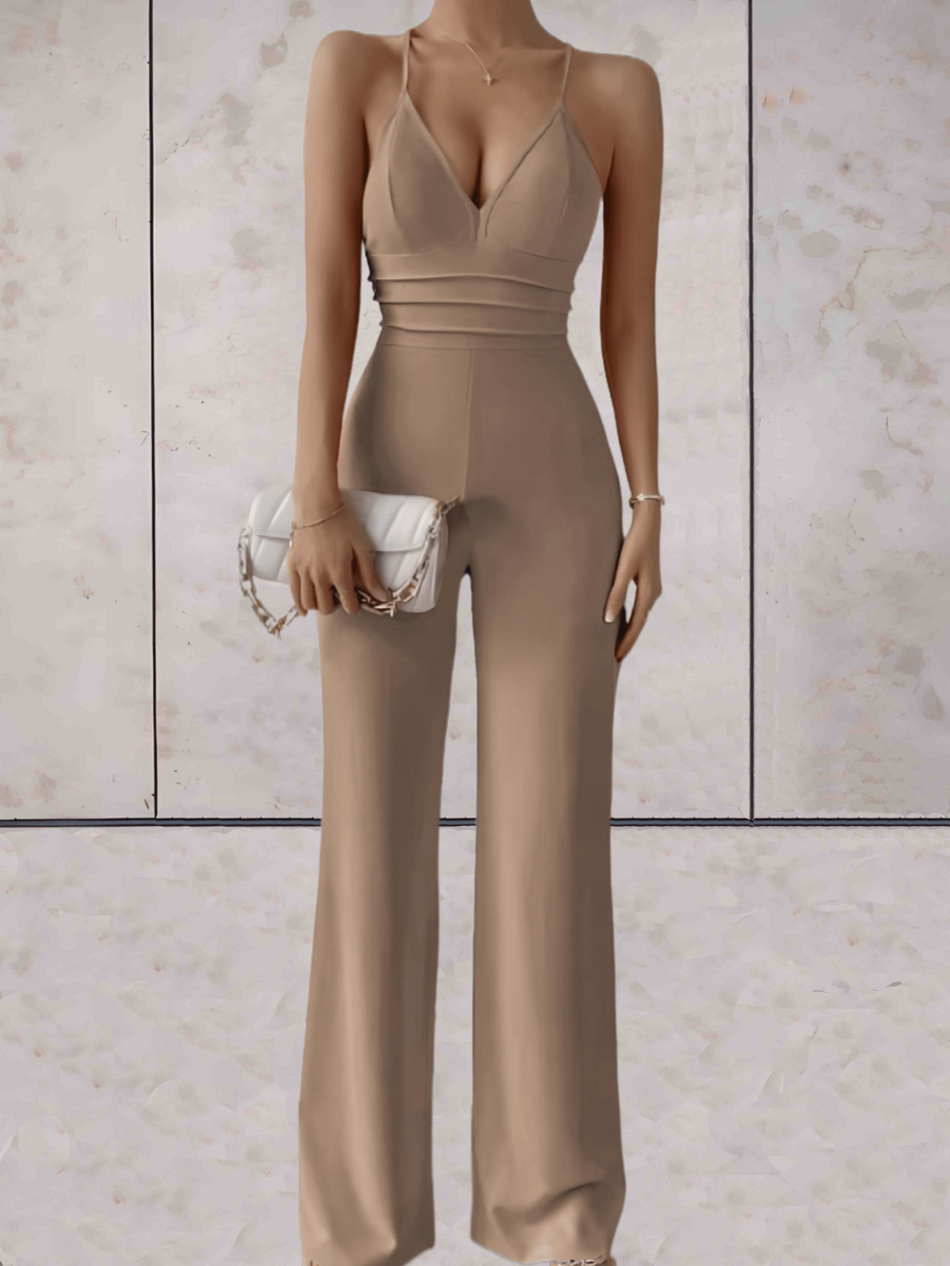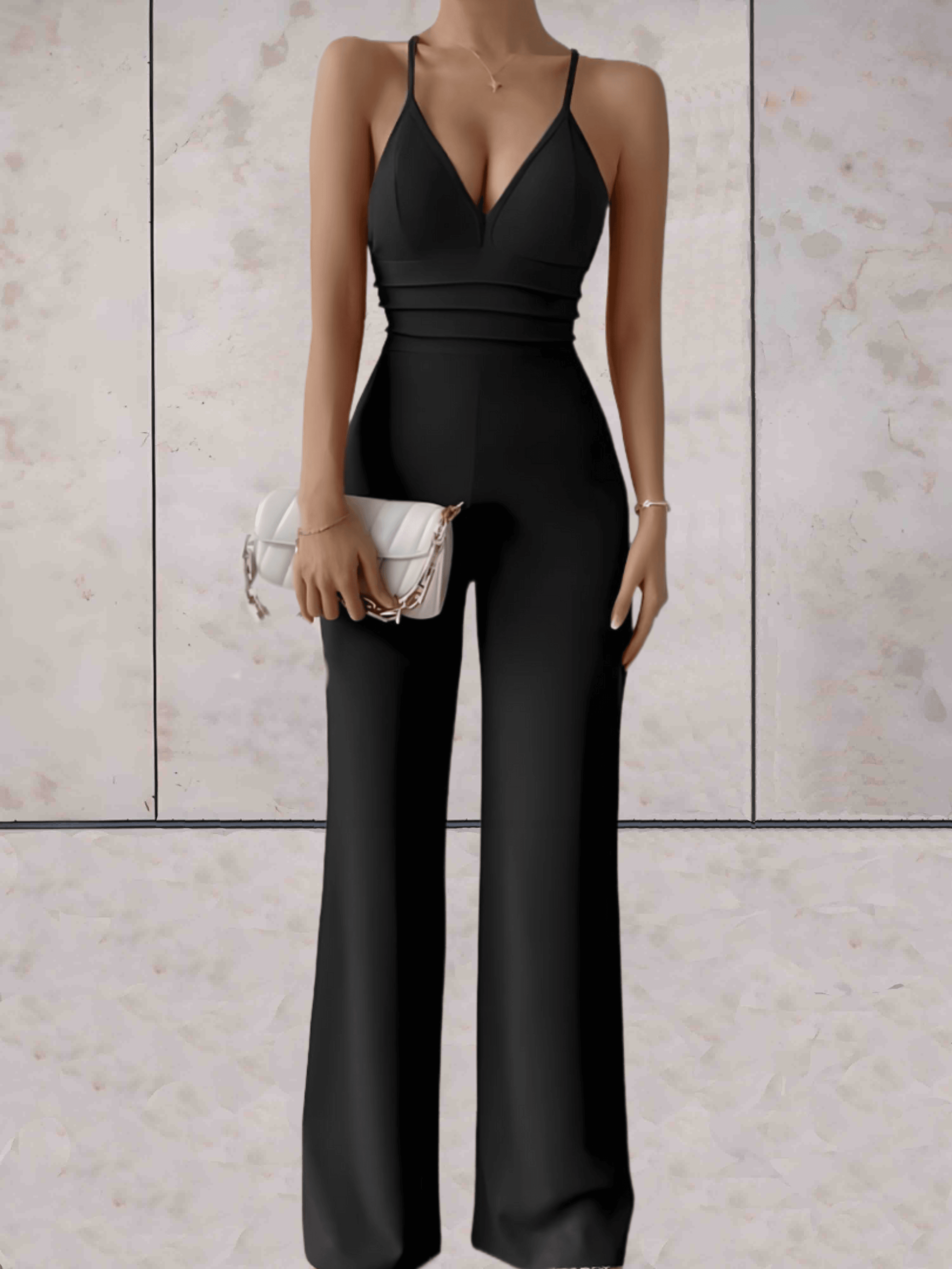 Brianna | Strakke en chique jumpsuit laag v-uitgesneden mouwloos, rugloos met wijde pijpen