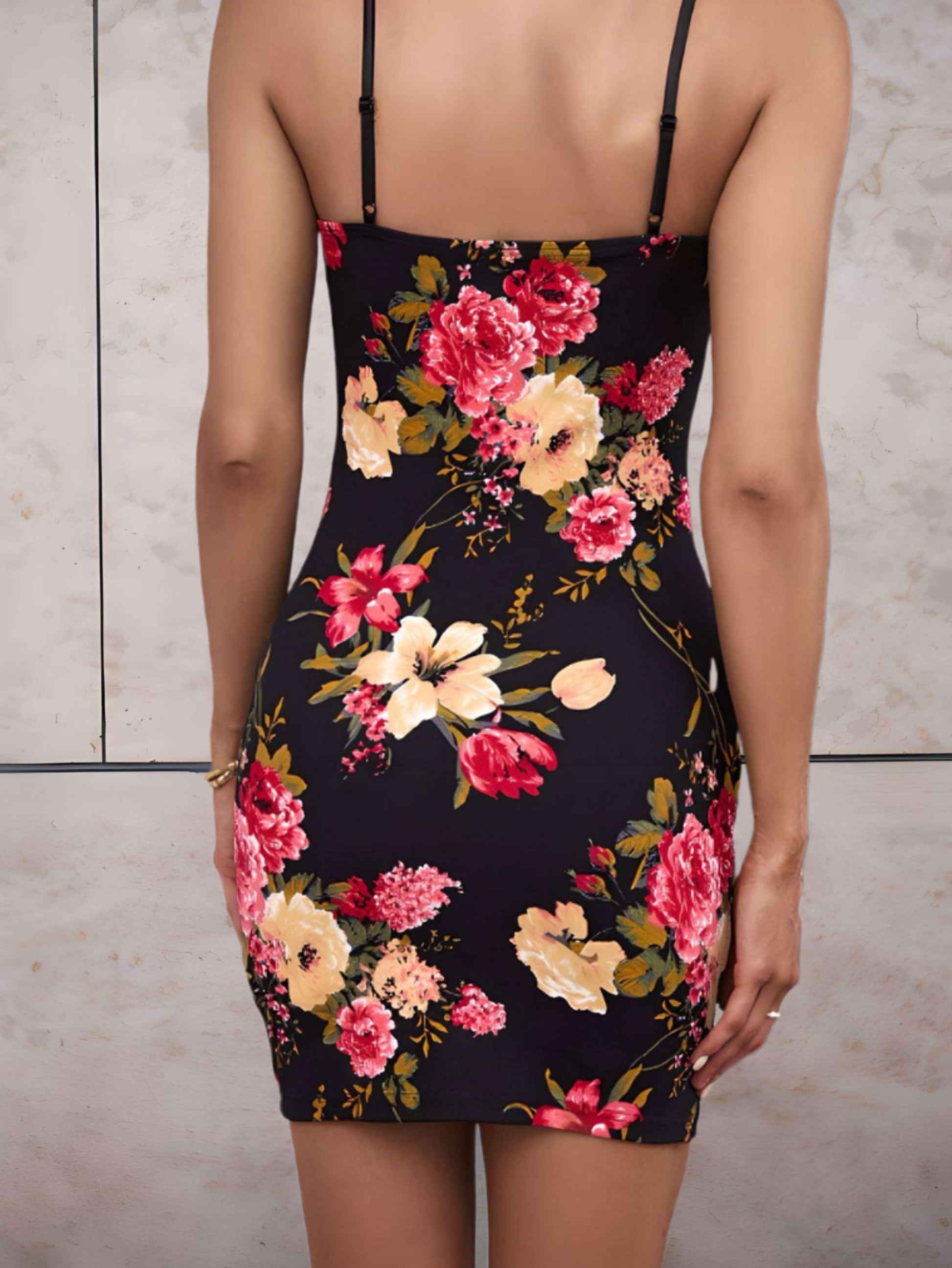 Brielle - Strakke mini jurk met rode en gele bloemen in zwart