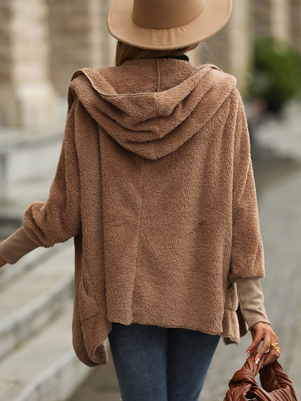 Deze leuke jas heeft lange mouwen met elastische boorden, een capuchon en twee zakken. De jas is gemaakt van een bruine teddy stof.