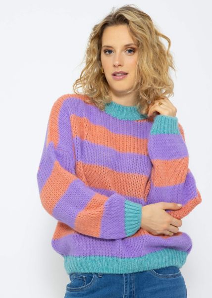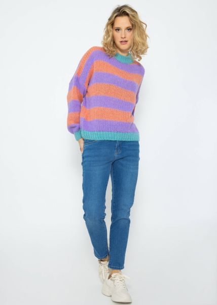 Verrijk je garderobe met de "Celina" trui, een stijlvolle aanvulling op onze Dames & Truien collectie. Deze trui combineert klassieke strepen met levendige kleuraccenten in oranje en paars, wat zorgt voor een frisse en modieuze look.