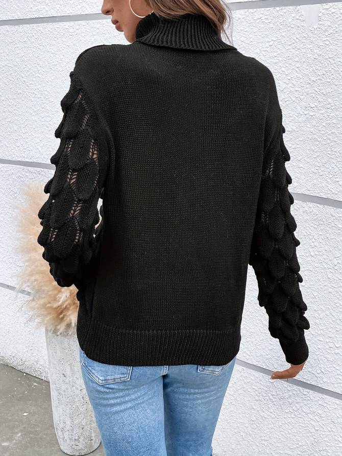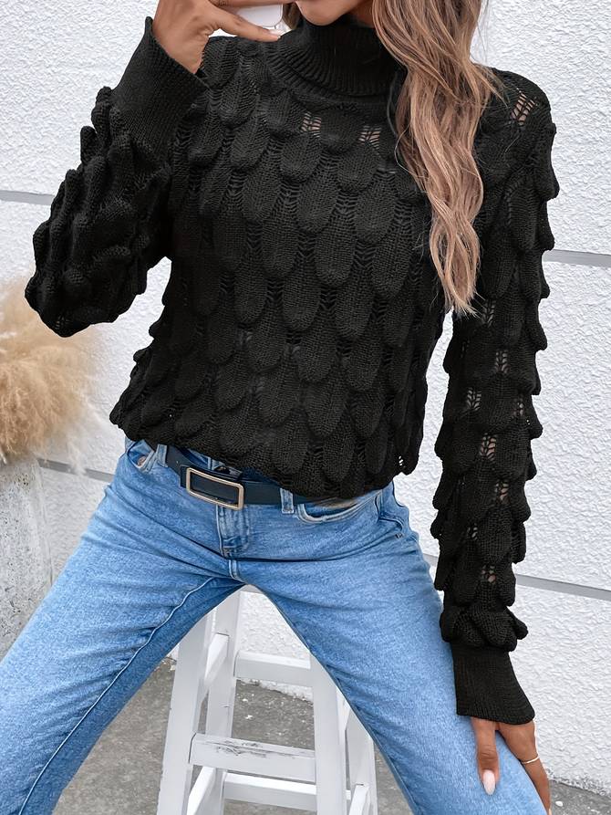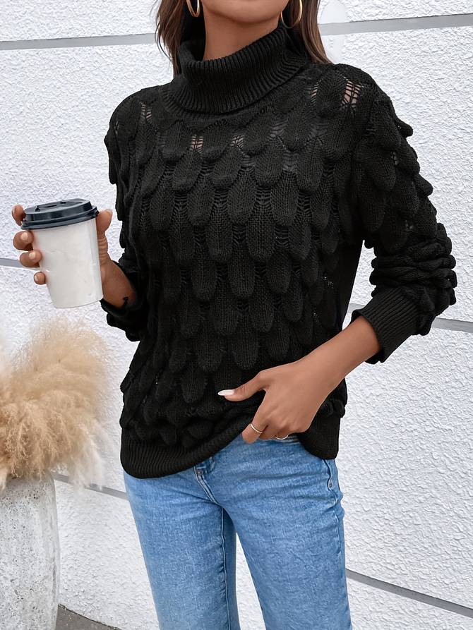 Omarm de luxe van de winter met onze coltrui met schubmotief. Casual en elegant, met een visgraatmotief in de col en ribgebreide textuur. Draag hem met een nauwsluitende broek of rok en voeg laarzen toe voor extra warmte en stijl.