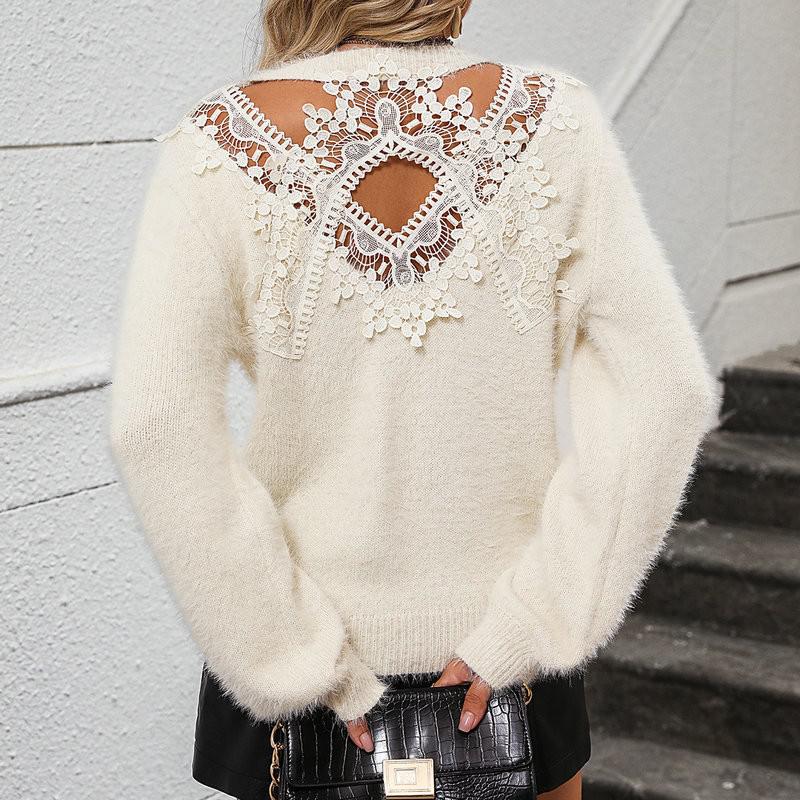 Deze trui heeft lange mouwen, een ronde hals en kanten details op de rug. De trui heeft een oversized fit en is gemaakt van een zachte, comfortabele stof.