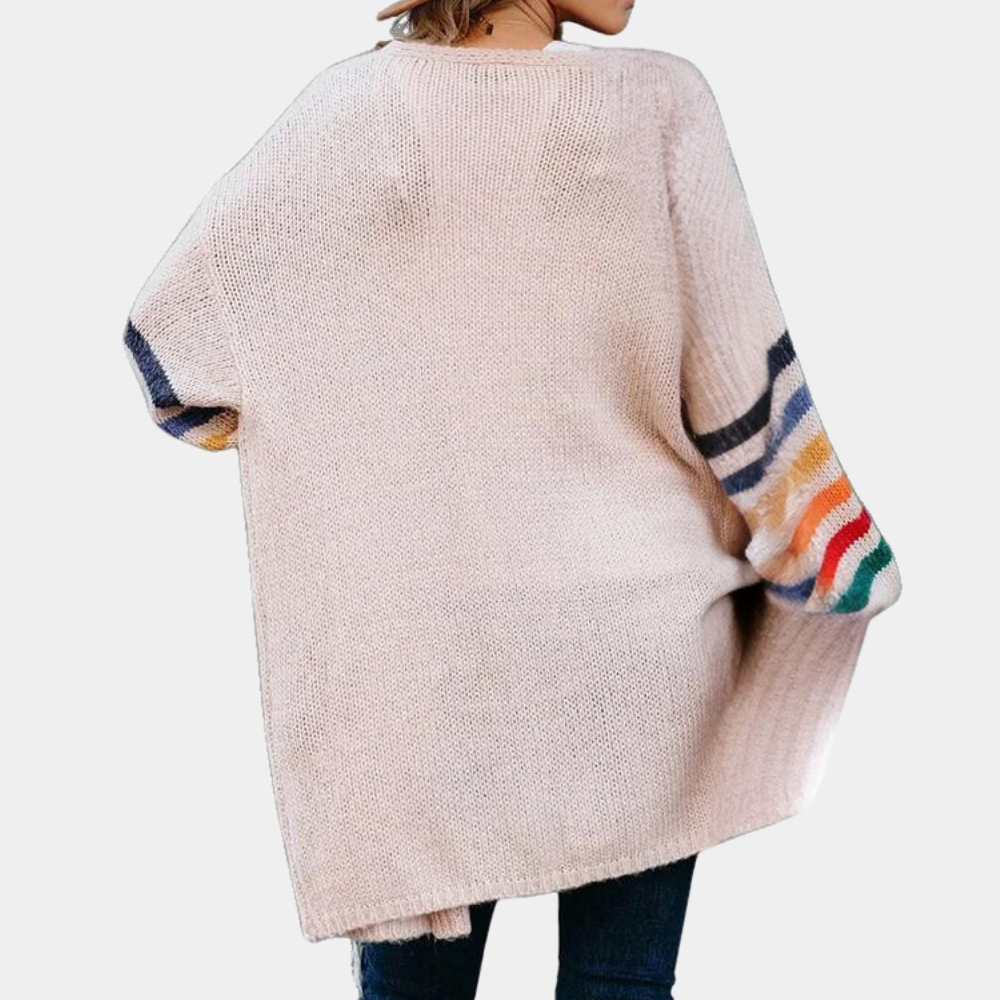 Op zoek naar een stijlvol, luchtig en uniek kledingstuk voor je garderobe? Kijk dan niet verder dan onze Camilla Damescardigan met regenboogprint!