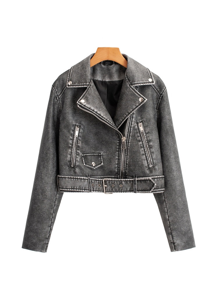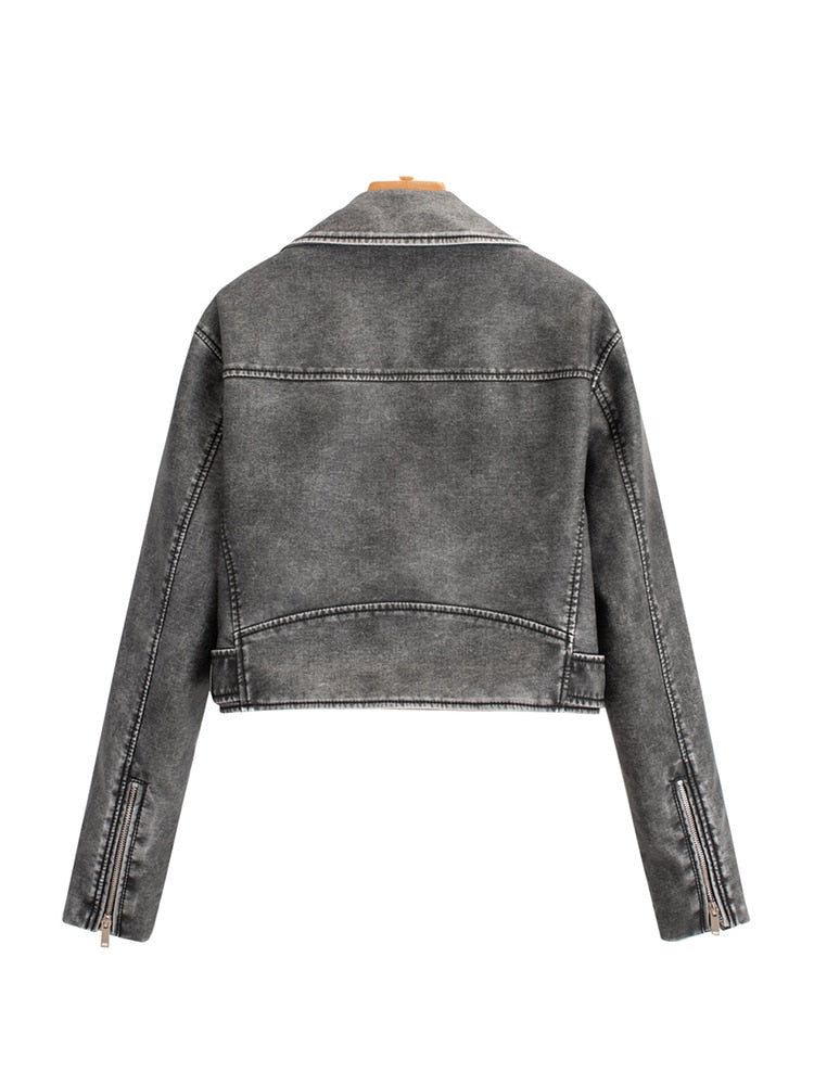 Dit donkergrijze jack heeft lange mouwen, zakken, een reverskraag met inkeping, een ceintuur en een asymmetrische rits. Het jack heeft een washed denim look.