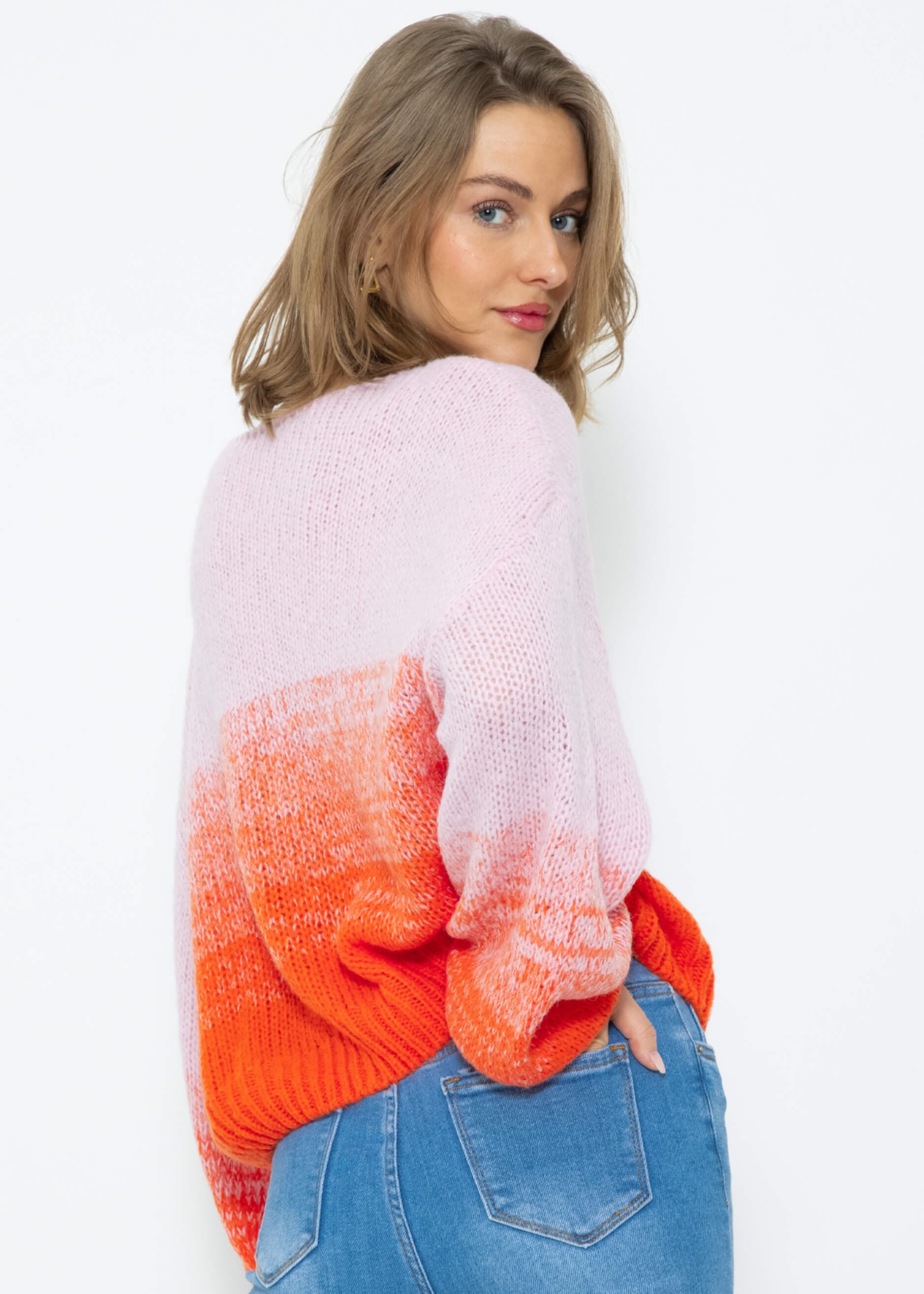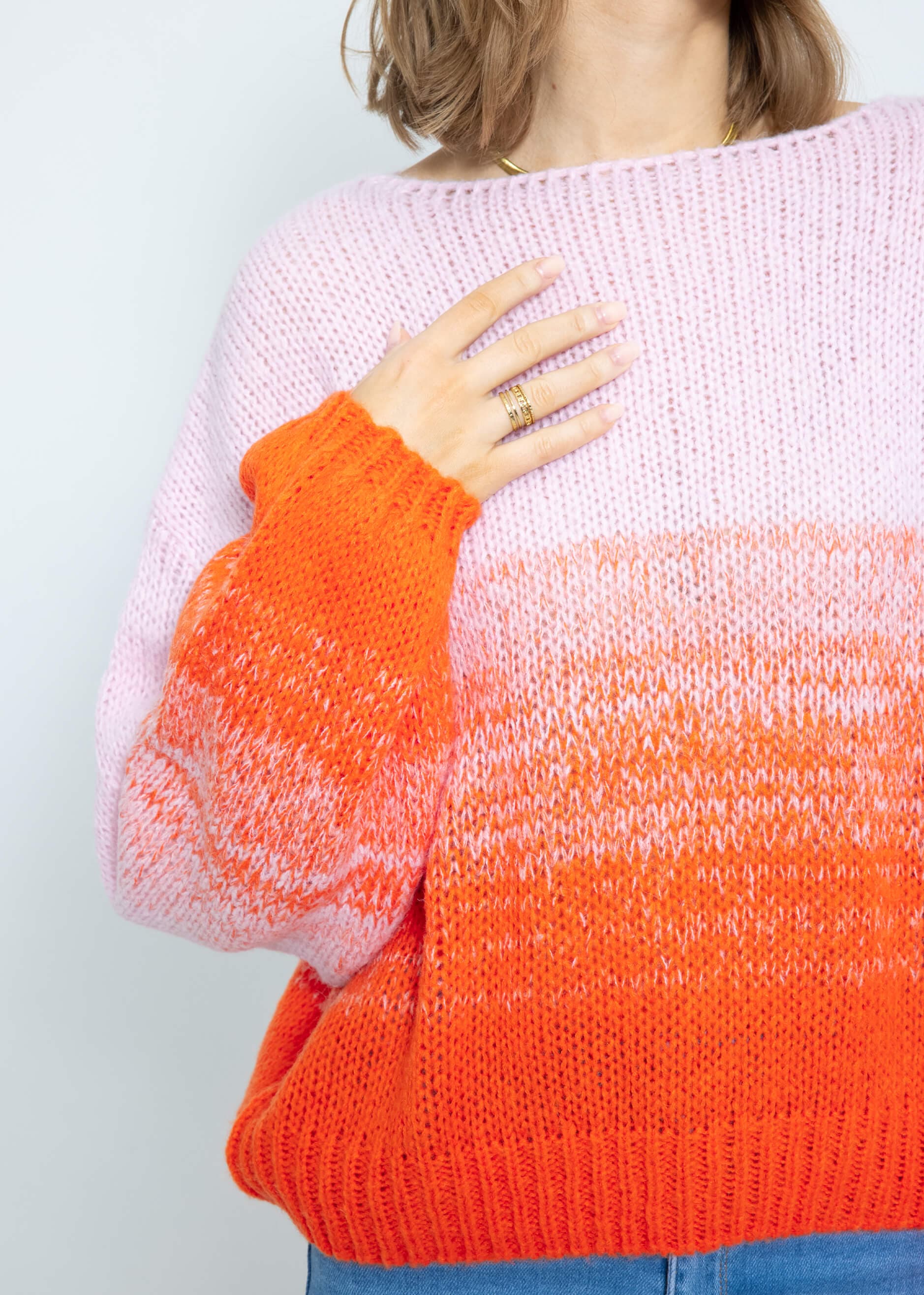 Ontdek de "Doris" - een trui die elegantie combineert met comfort. Deze unieke trui met ballonmouwen en een betoverend kleurverloop van roze naar oranje is perfect voor elke garderobe.