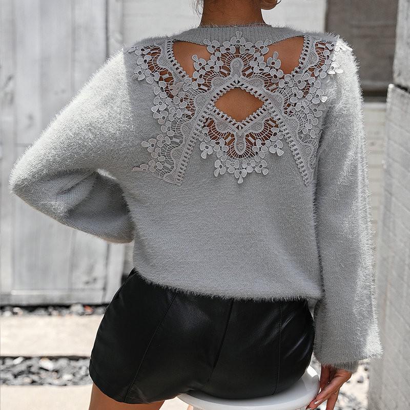Deze trui heeft lange mouwen, een ronde hals en kanten details op de rug. De trui heeft een oversized fit en is gemaakt van een zachte, comfortabele stof.