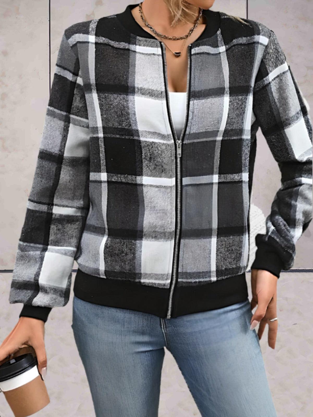 Jellai - Zwart oversized geruit jack met ritssluiting en getailleerd polsontwerp