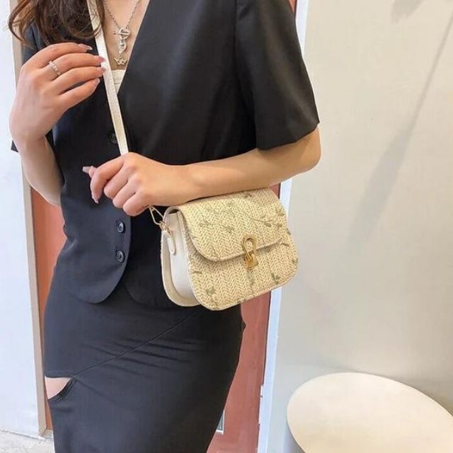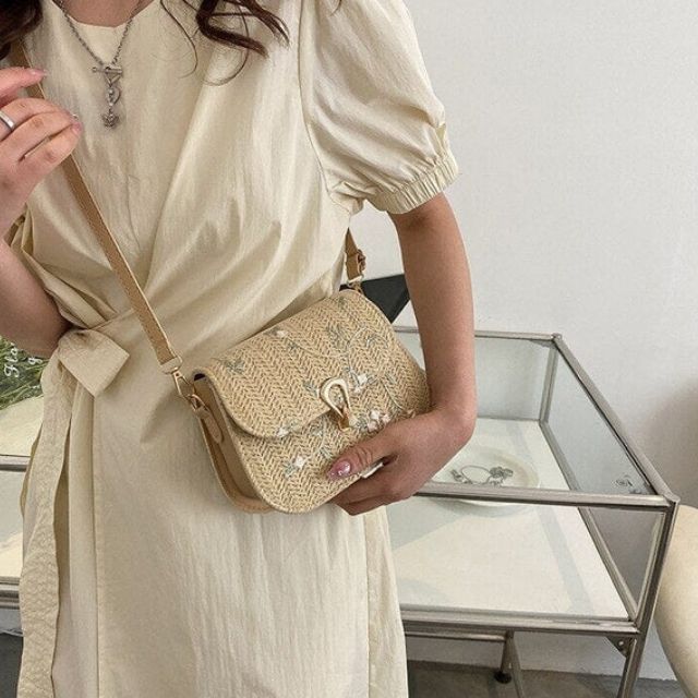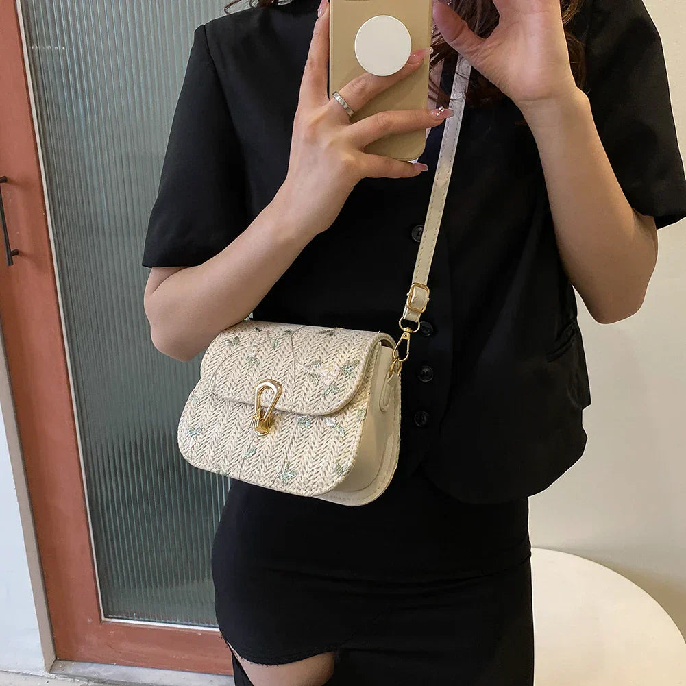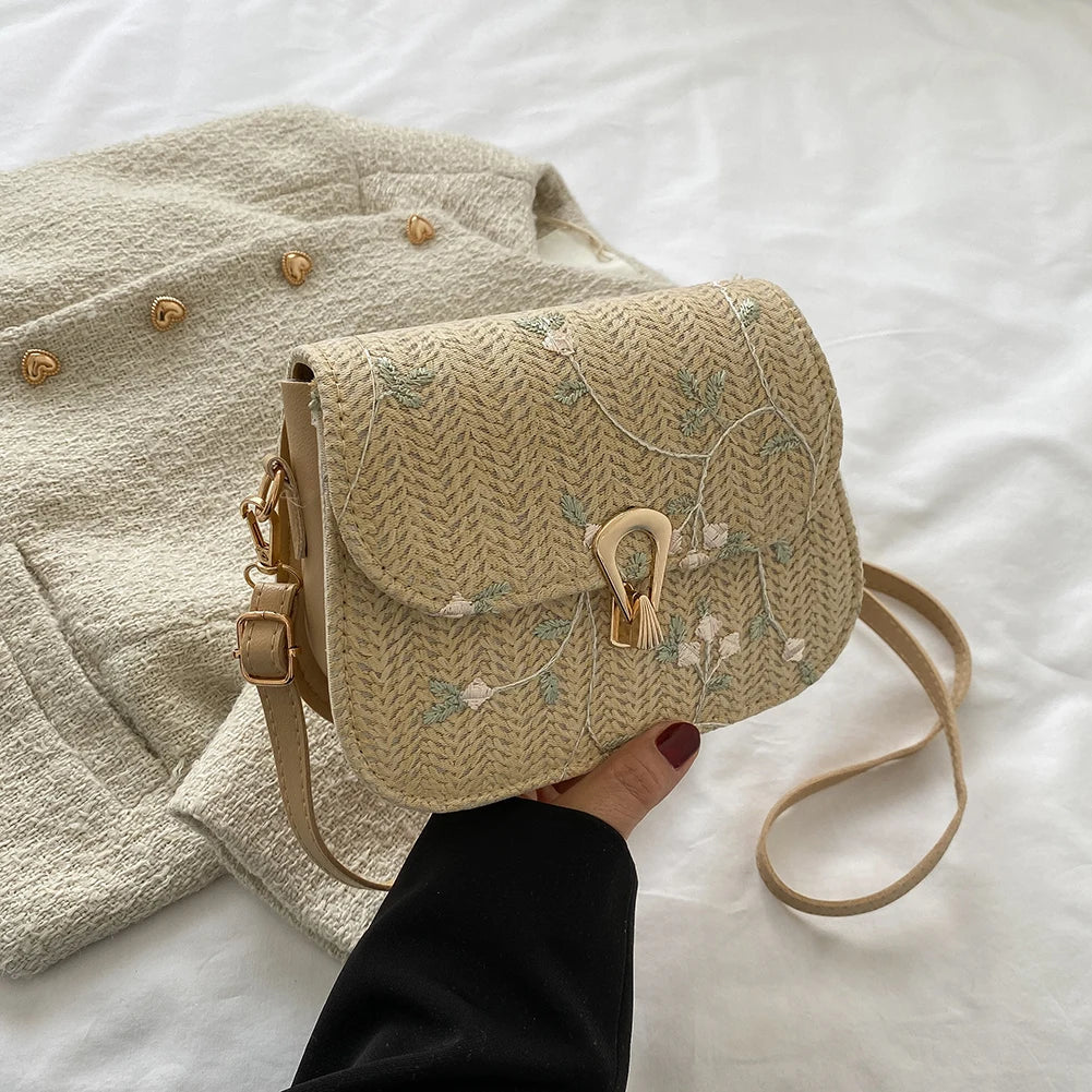 Deze Liana - Geborduurde schoudertas van stro biedt een vleugje rustieke elegantie. Het lichte materiaal en de natuurlijke textuur maken het de ideale accessoire voor zonnige dagen of een casual brunch. De verstelbare leren riem biedt stylingveelzijdigheid, of hij nu over de schouder of over het lichaam wordt gedragen, waardoor het een heerlijke keuze is voor elke zomerse outfit.