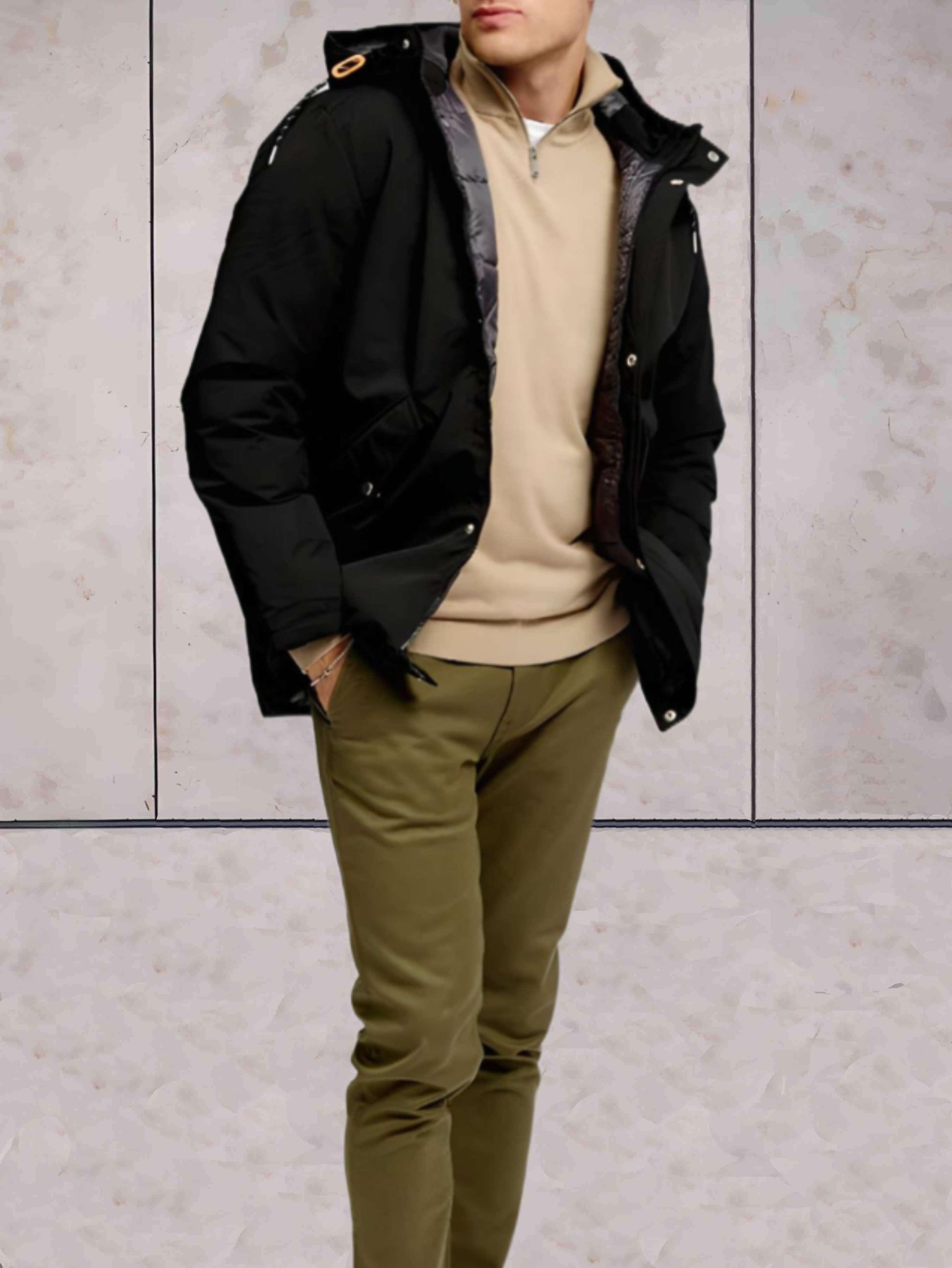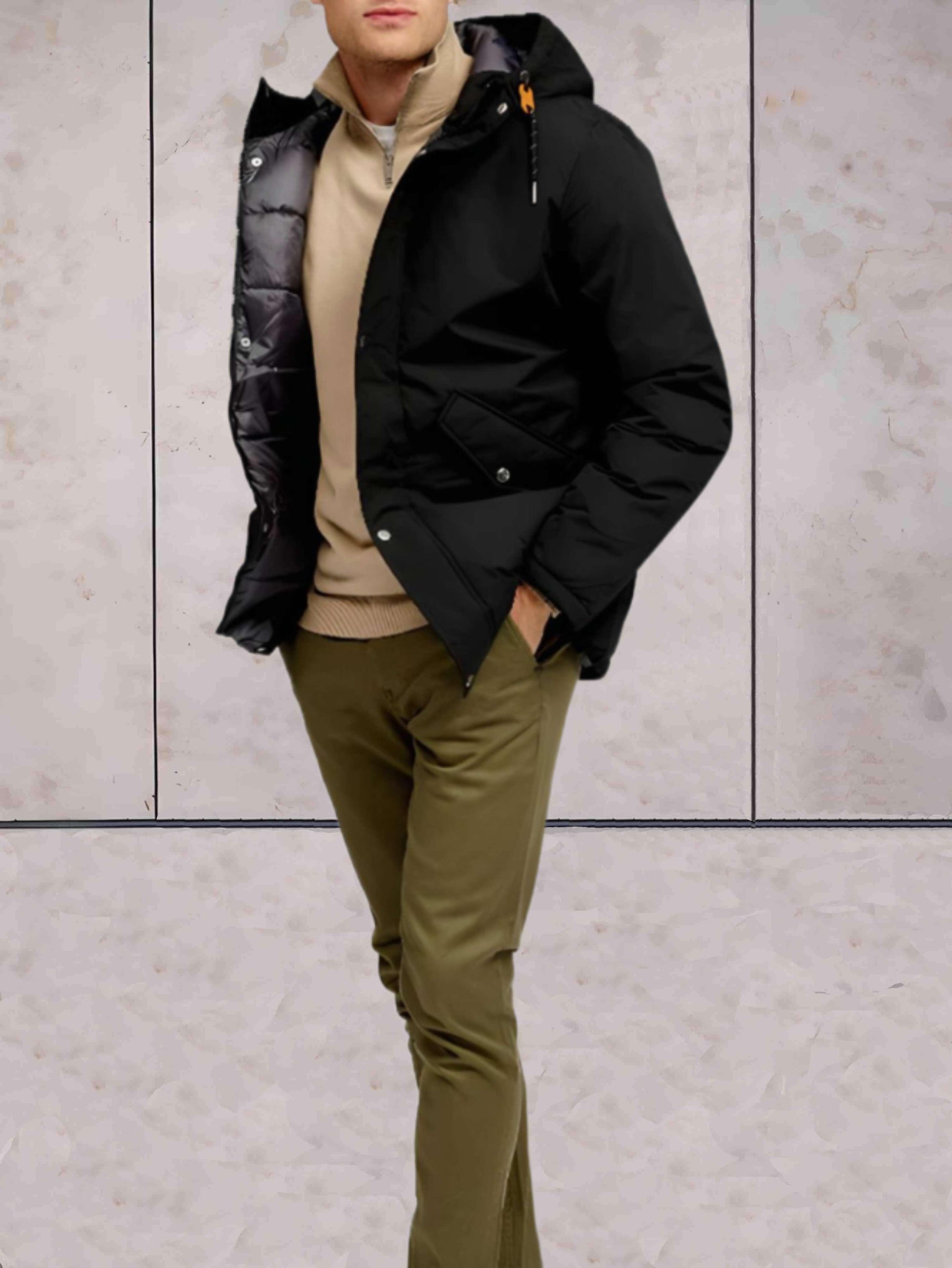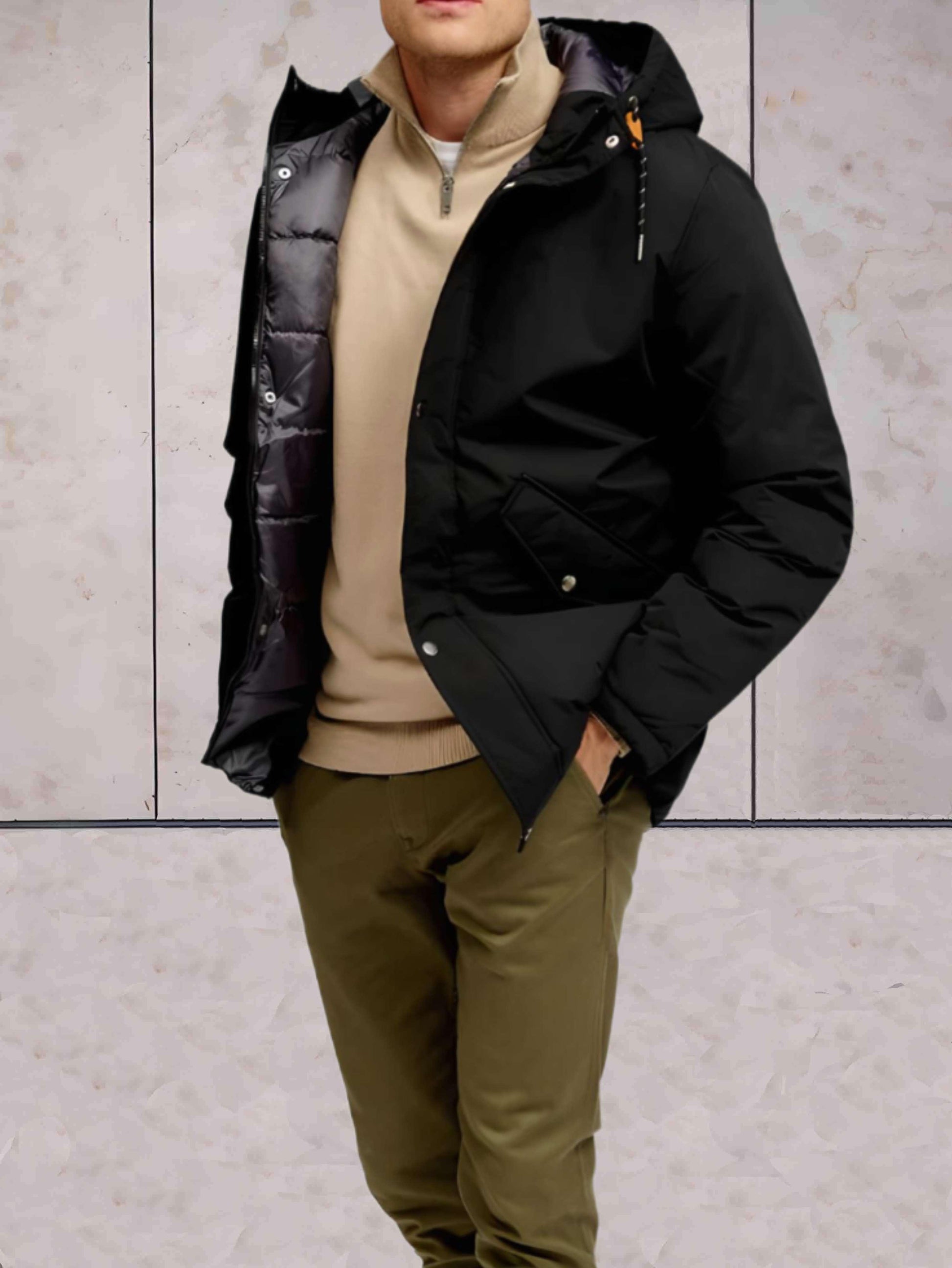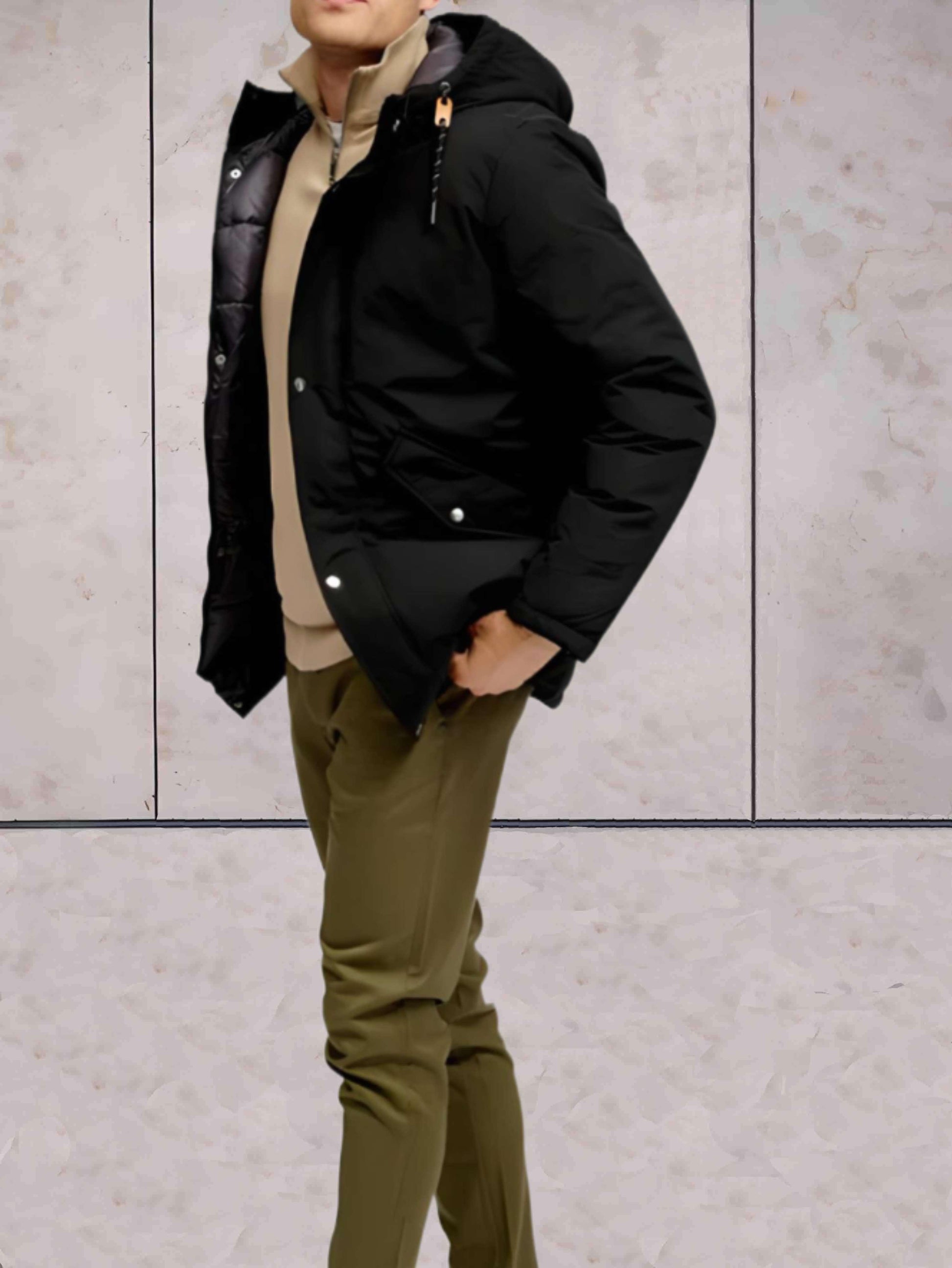 Marlou - dikke en warme zwarte jas met capuchon, hoge halslijn met combinatie van knoop- en ritssluiting