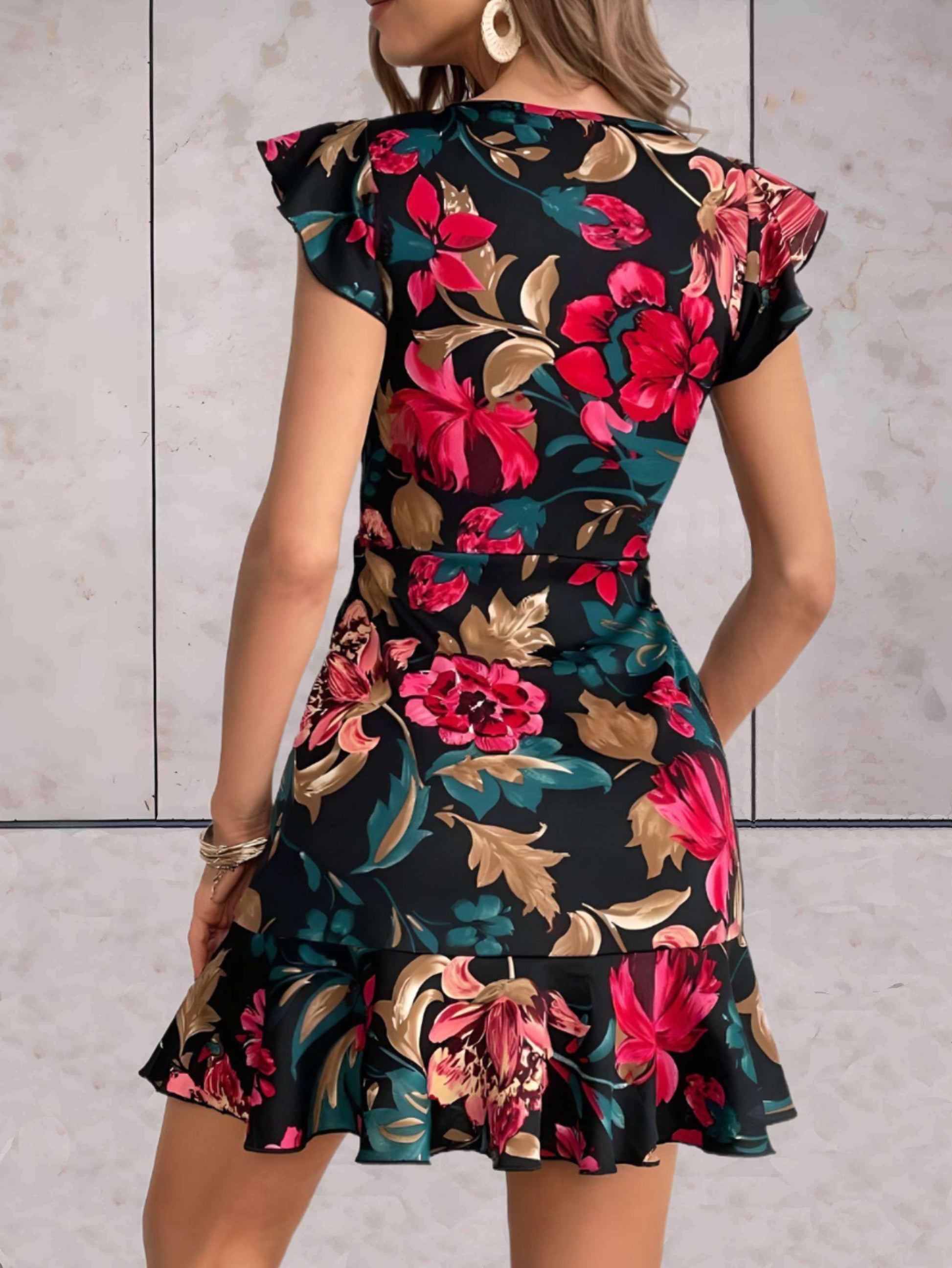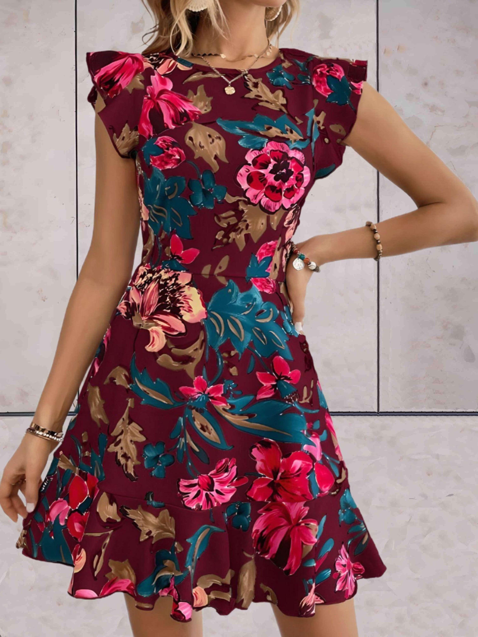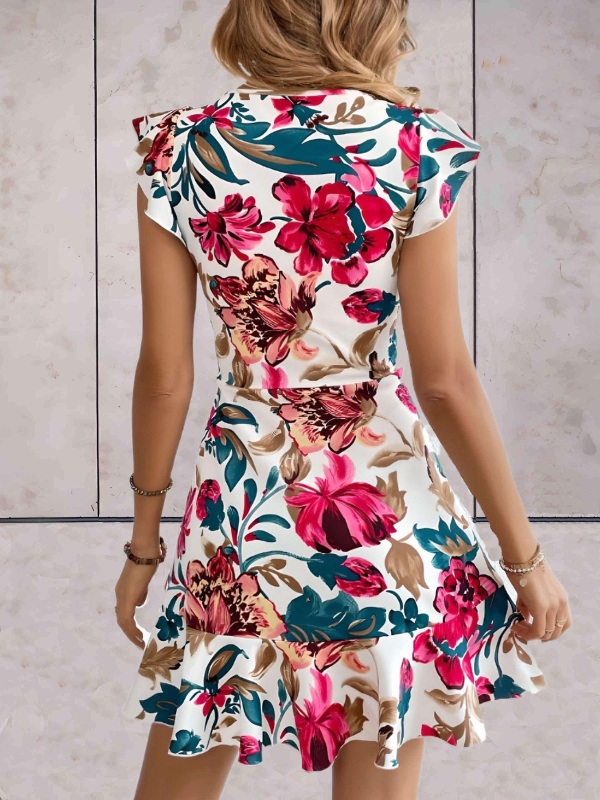 Ramona - stijlvolle gebloemde jurk met korte mouwen en ruches aan de mouwen en onderkant