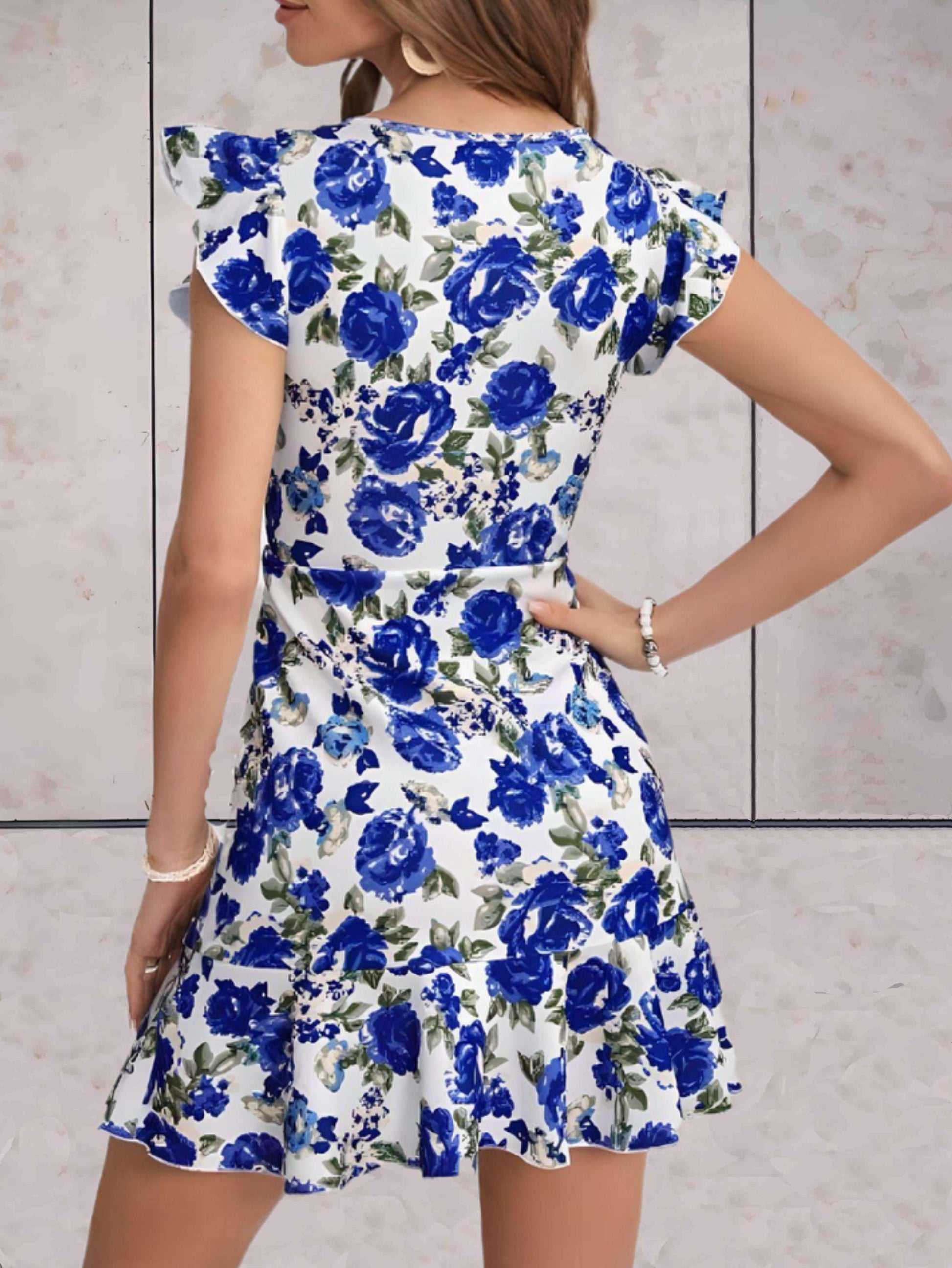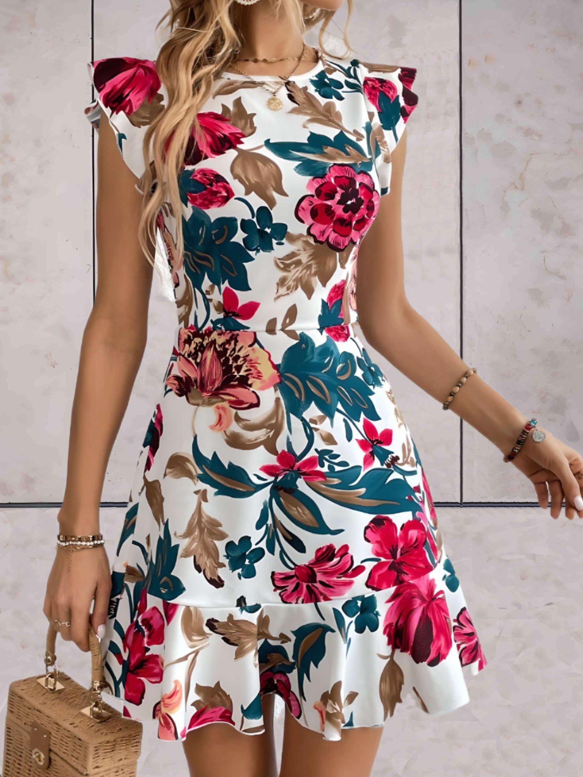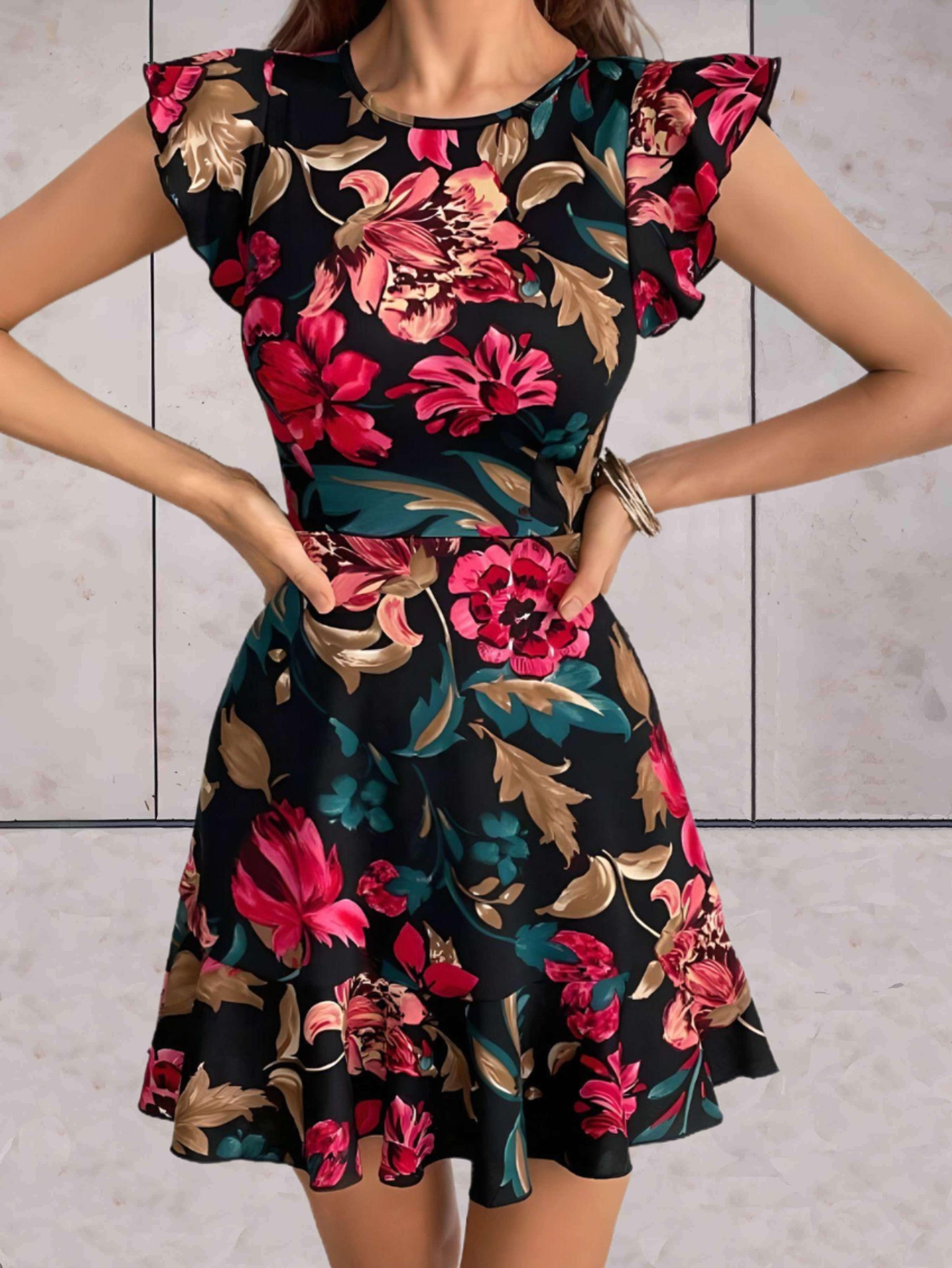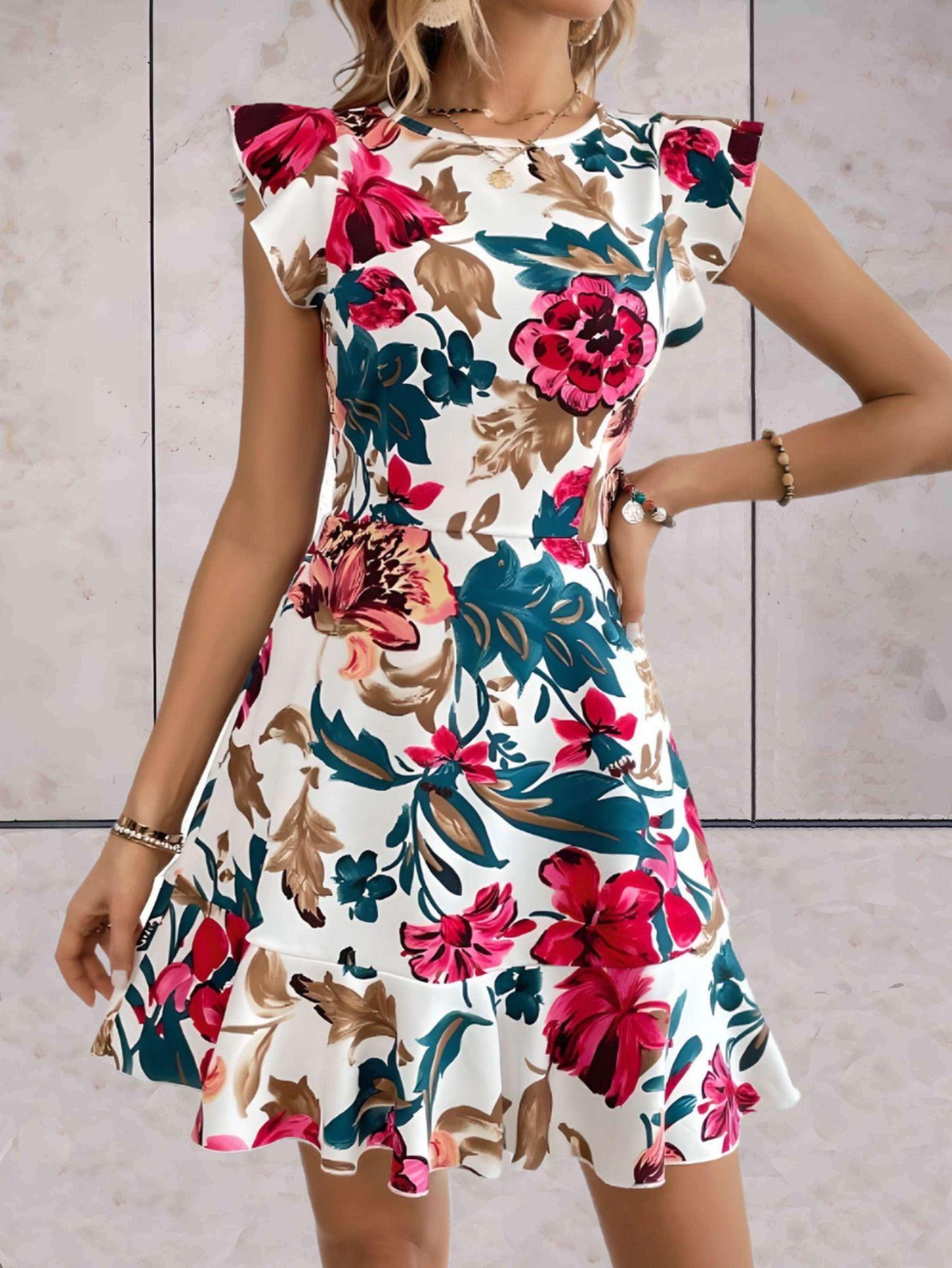 Ramona - stijlvolle gebloemde jurk met korte mouwen en ruches aan de mouwen en onderkant