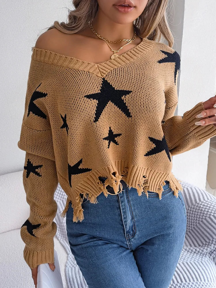 Deze leuke trui heeft lange mouwen, een v-hals en een korte pasvorm. De trui is voorzien van sterren en is aan de onderkant gerafeld. Draag de trui met een jeans en jouw winteroutfit is compleet!