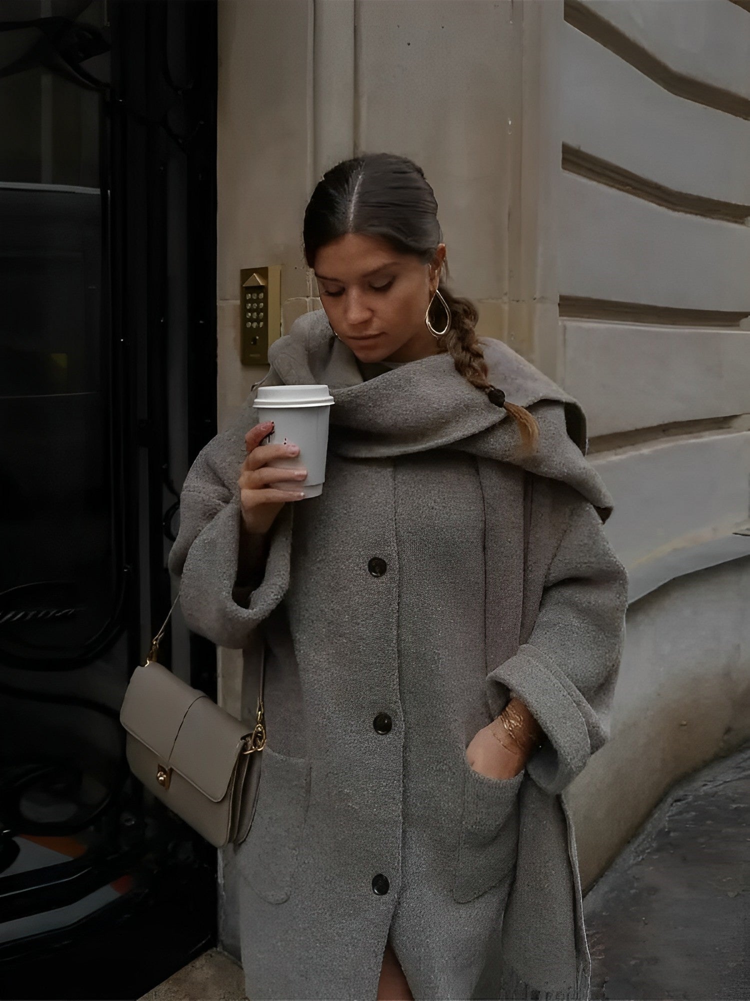 Ontdek de perfecte combinatie van comfort en stijl met onze wollen jas 'Cozy Elegance', compleet met geïntegreerde sjaal voor frisse dagen.