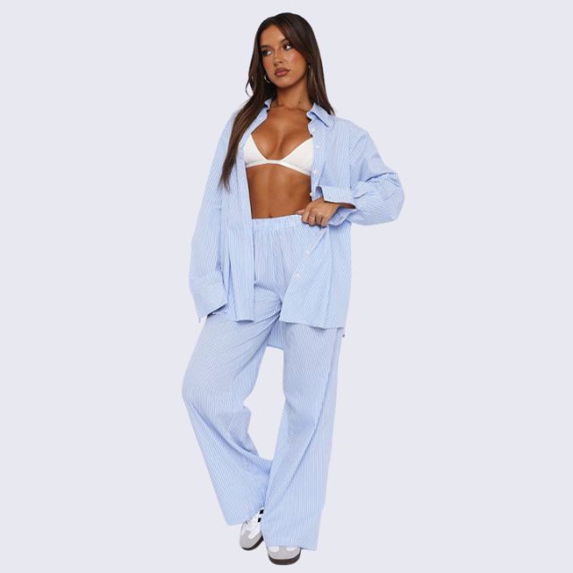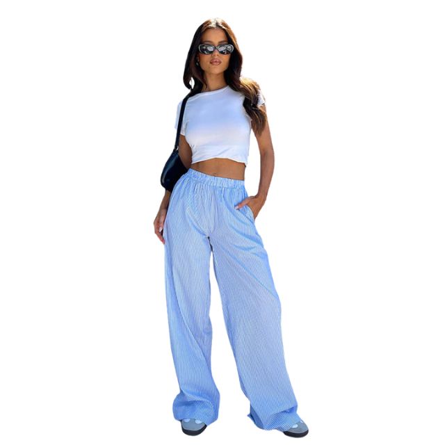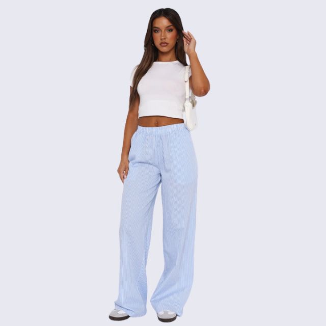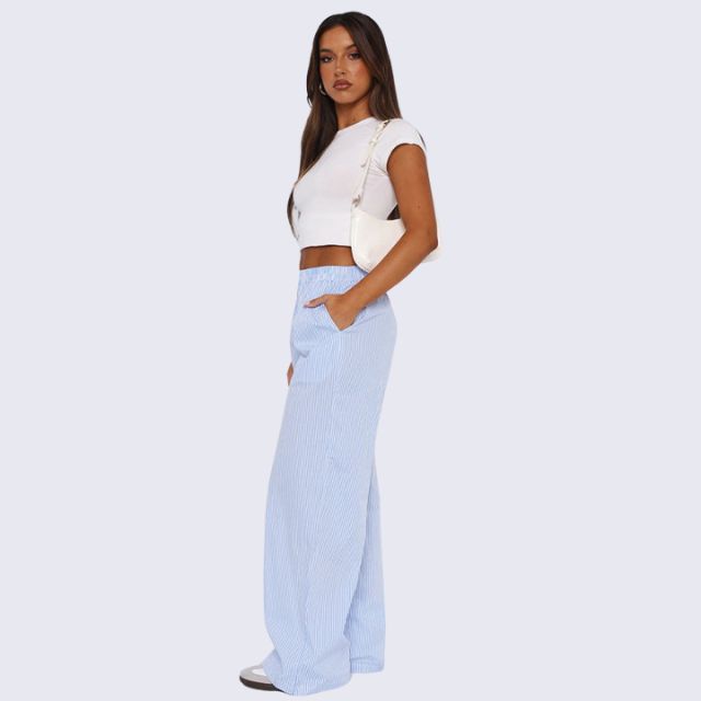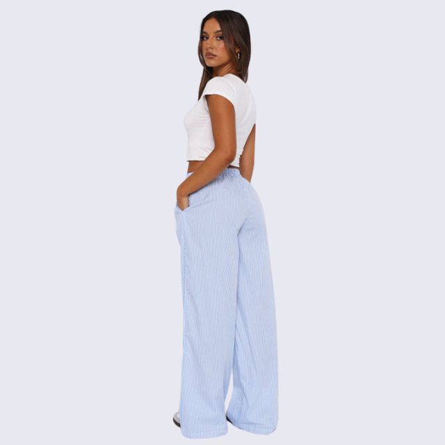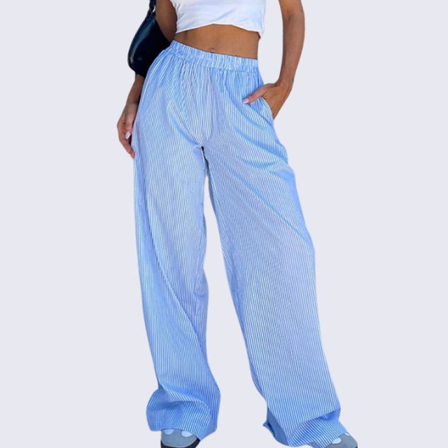 Ontdek de perfecte combinatie van comfort en stijl met onze Savannah - Gestreepte palazzo broek met wijde pijpen. Met een nonchalante, elastische hoge tailleband voor een gemakkelijke pasvorm en zakken voor functionaliteit is deze loungebroek een must-have voor elke streetwearliefhebber. De verticale strepen en het relaxte silhouet weerspiegelen de casual flair van de jaren 2000, perfect om een trendy maar moeiteloos statement te maken.