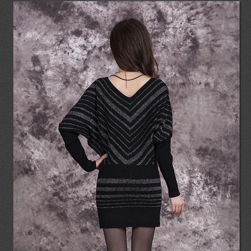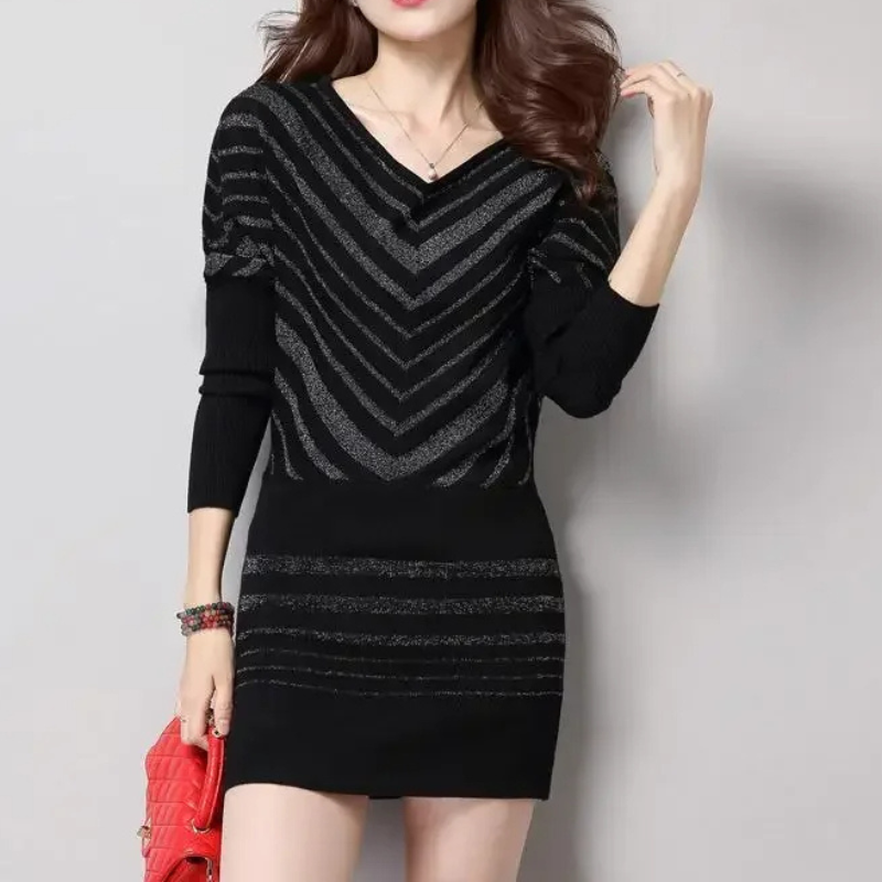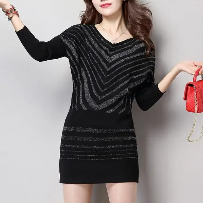 Vormvast - V-Hals Jurk met Vleermuismouwen en Chevron Patroon, Gebreide Dames Jurks