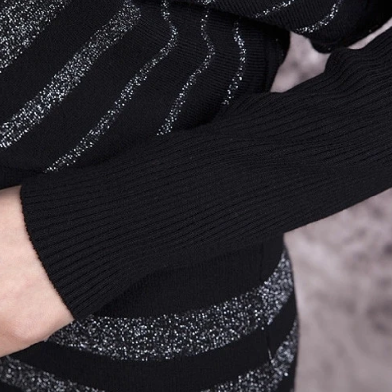 - Chevron Patroon: Het chevronpatroon in het breisel geeft de jurk een dynamische uitstraling en creëert een slank silhouet.