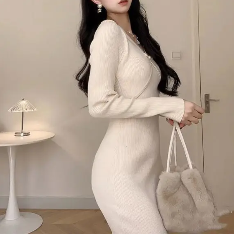 Waardju - Slim Fit Gebreide Jurk met Cut-Out Voorkant en Stretch Stof, Gebreide Dames Jurks