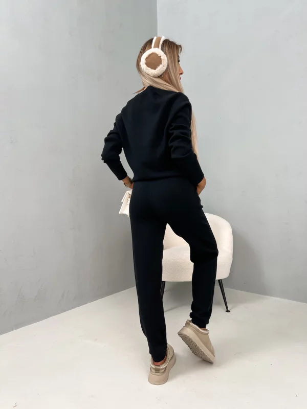 Ervaar het ultieme in relaxte elegantie met onze knusse jumper en joggerset, een perfecte mix van stijl en comfort. Dit veelzijdige ensemble vormt een naadloze overgang tussen casual chic en comfortabele loungewear.
