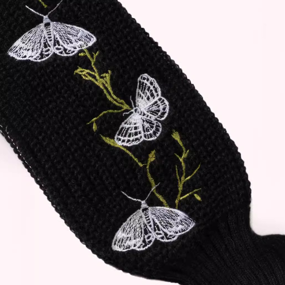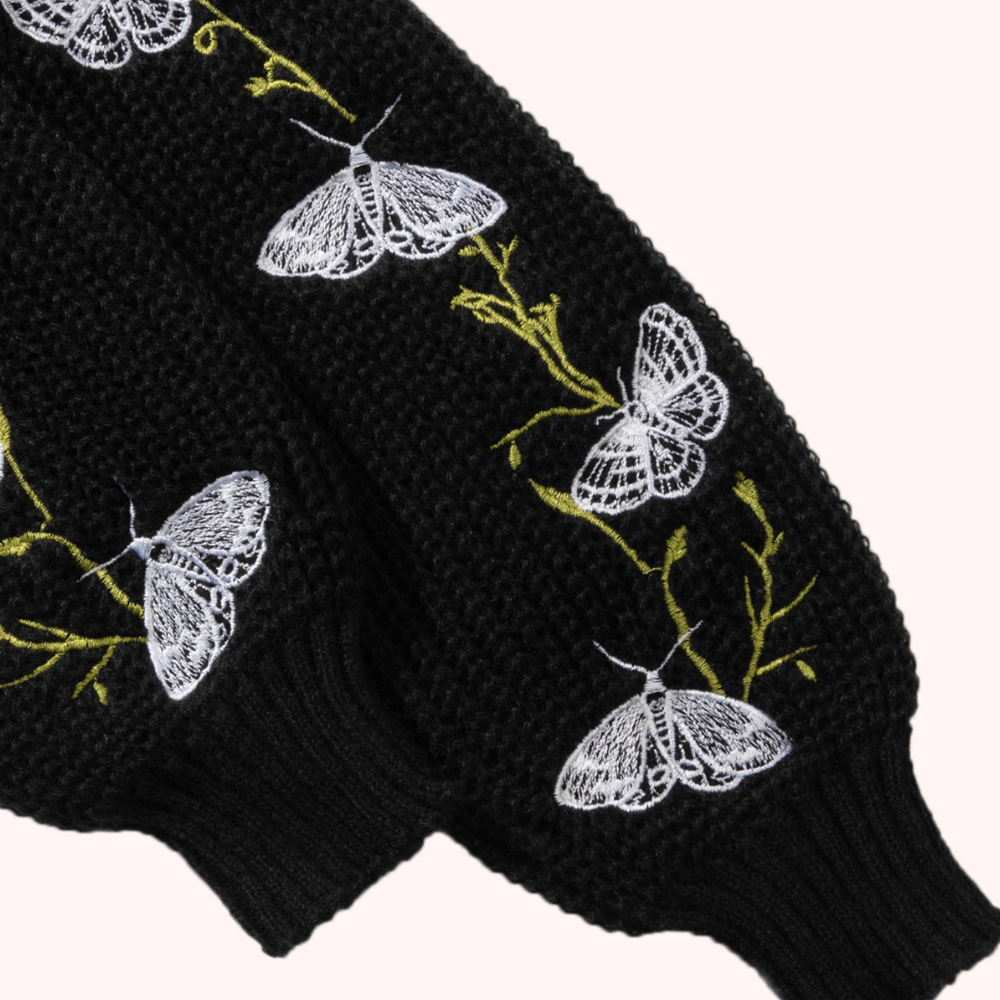 Het rijke zwarte stof is versierd met prachtig ontworpen witte vlinders, wat de trui een opvallende en artistieke uitstraling geeft die moeiteloos in het oog springt.