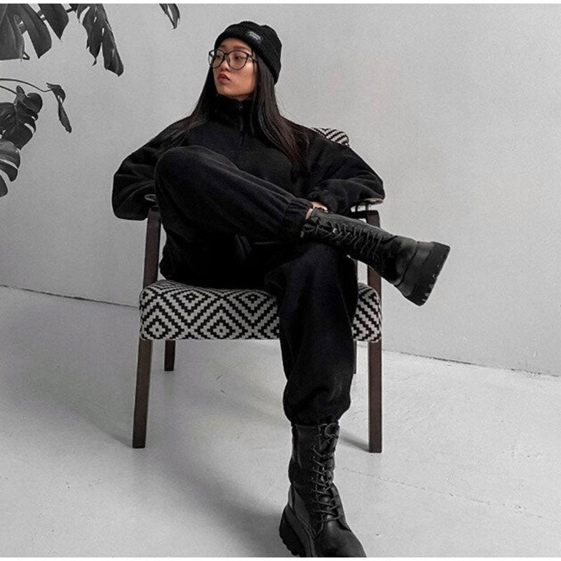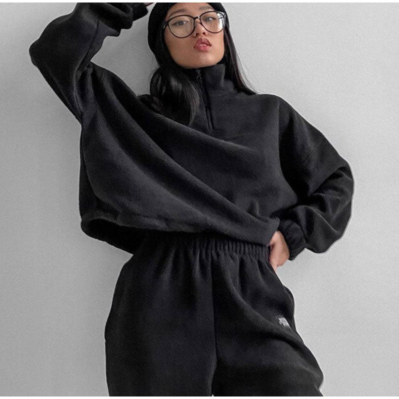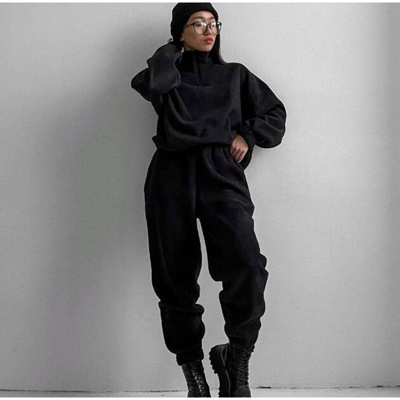 Comfy & stijlvol! Dit joggingpak bestaat uit twee delen. De trui heeft lange mouwen, een hoge opstaande kraag en een oversized pasvorm. De joggingbroek heeft een middelhoge elastische taille en boorden aan de onderkant van de pijpen. Het pak is gemaakt van een zachte stof en draagt comfortabel.